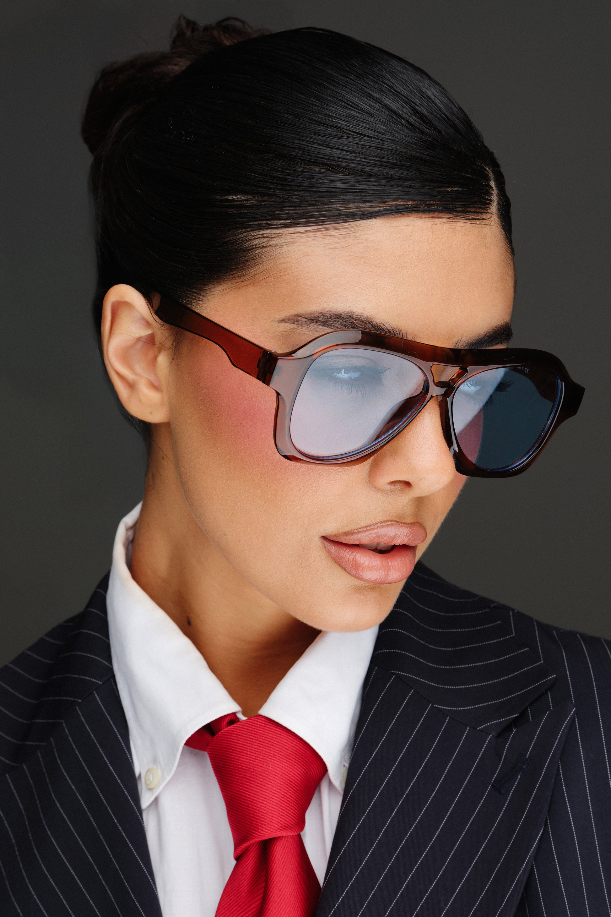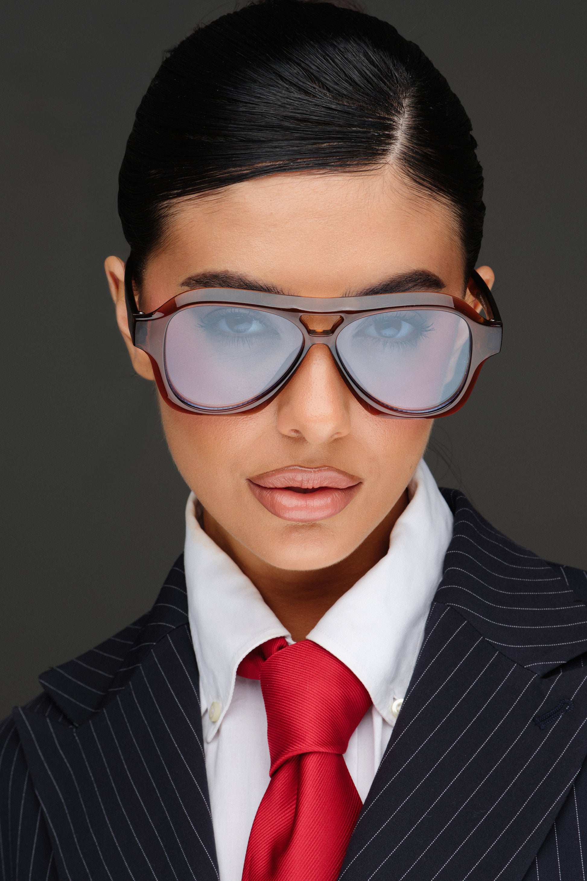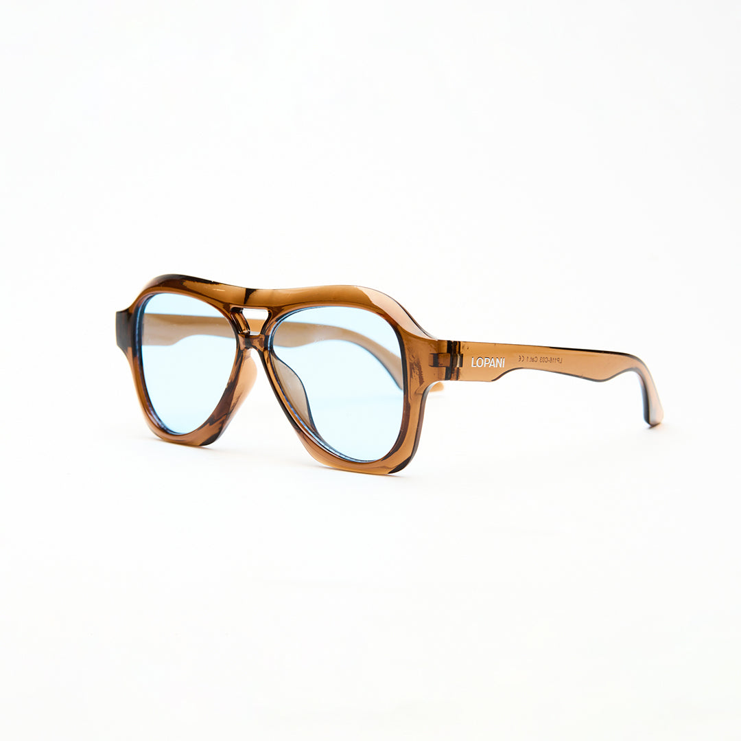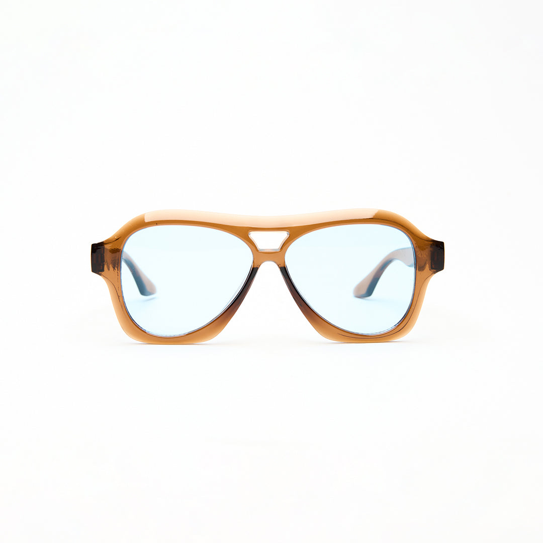 Occhiali da sole unisex con montatura trasparente color caramello e lenti azzurro chiaro. Il design avvolgente ispirato allo stile aviator unisce comfort e modernità, mentre la finitura semitrasparente dona un tocco fresco e distintivo. Perfetti per un look casual e contemporaneo.