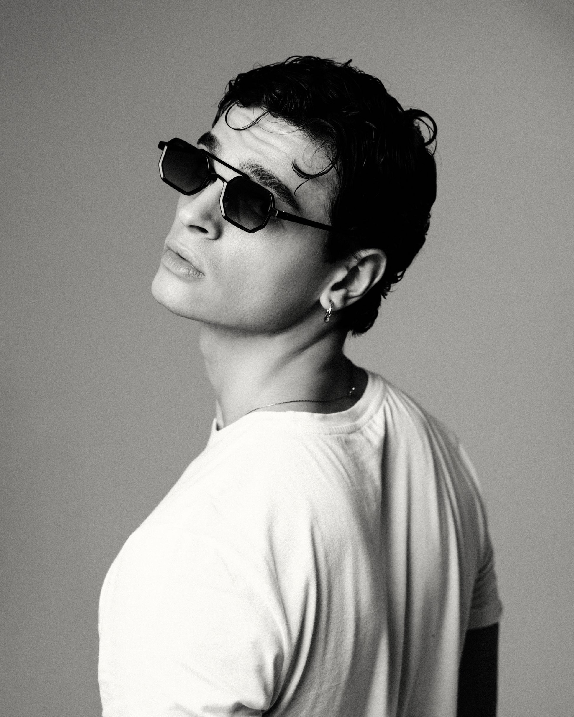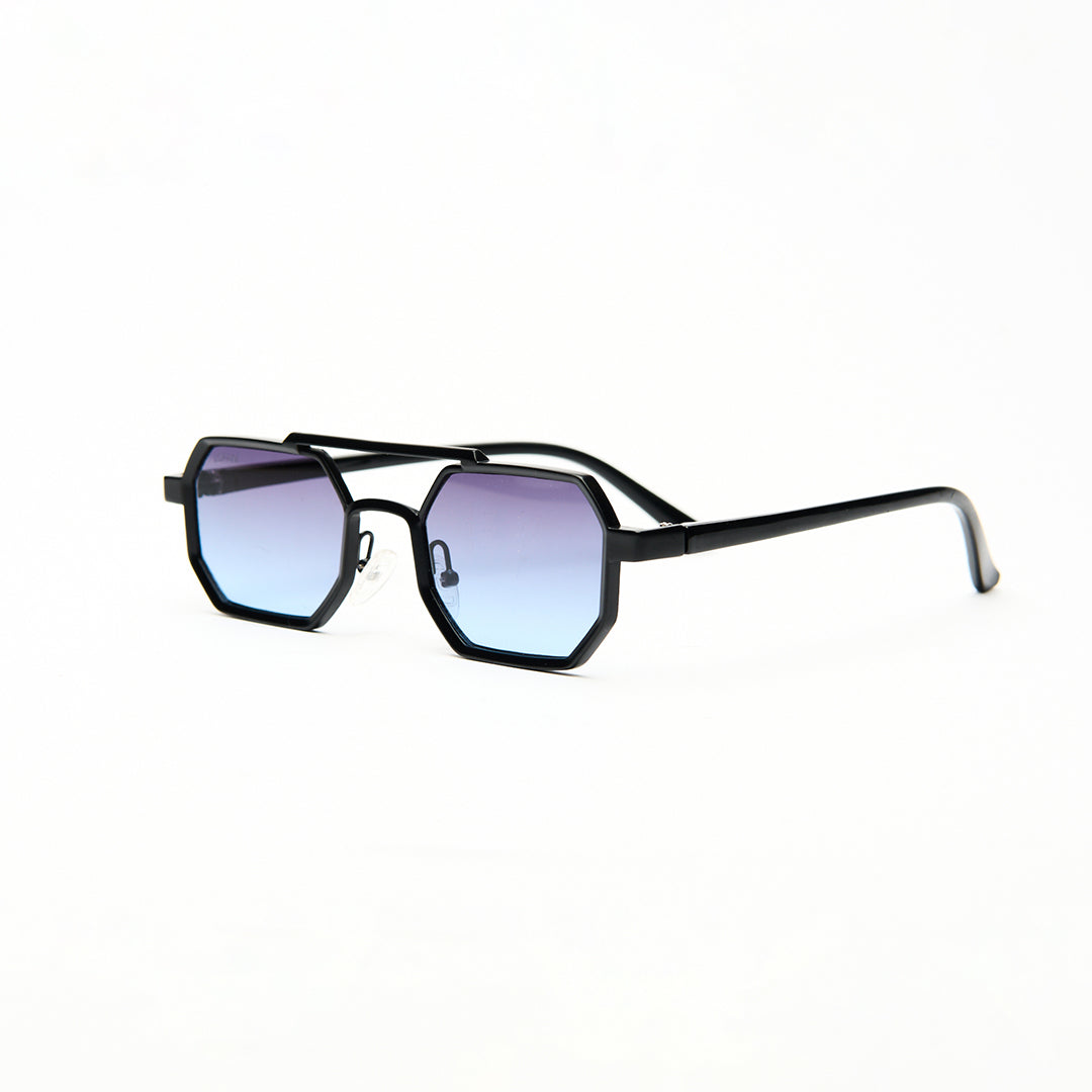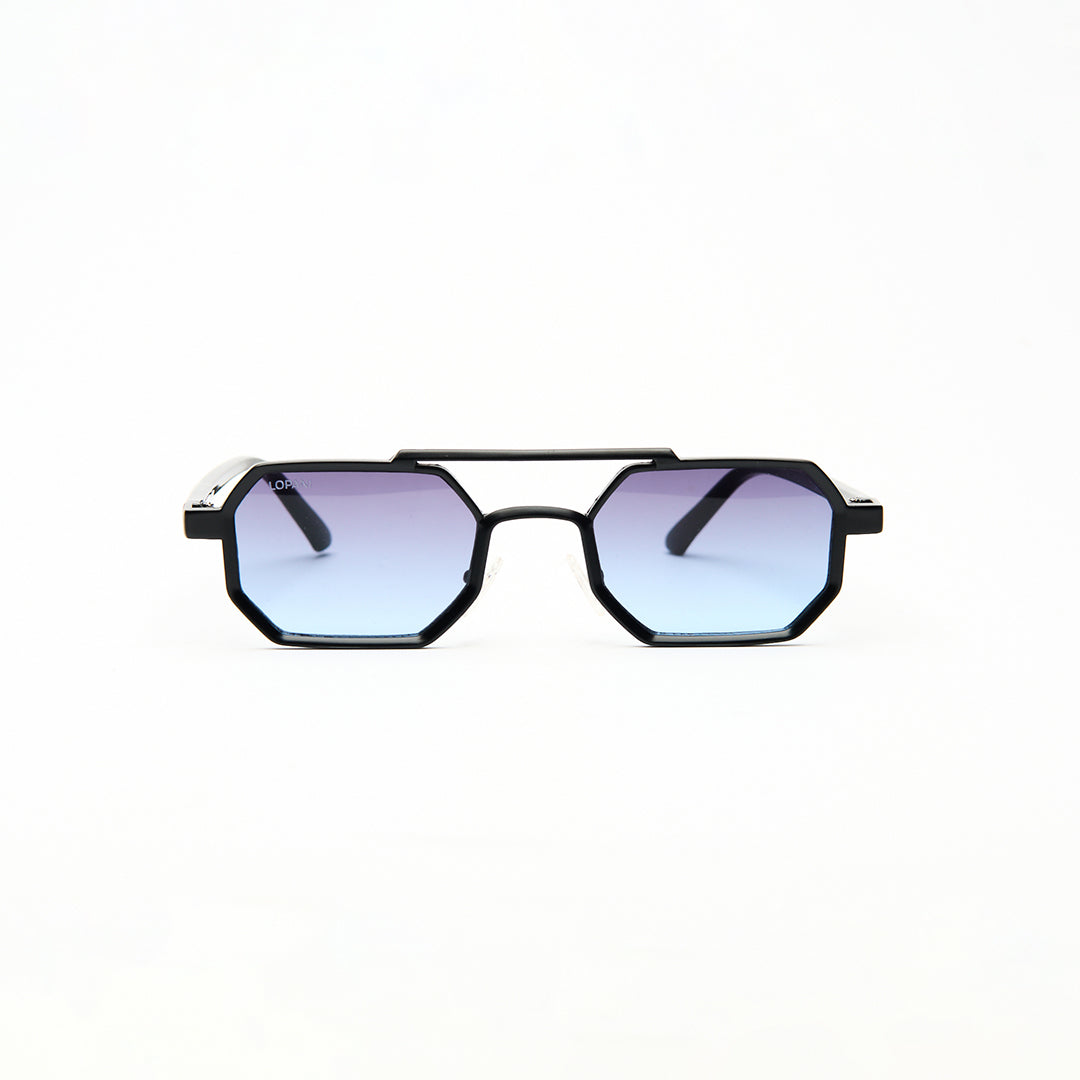 Occhiali da sole unisex con montatura nera e lenti ottagonali sfumate blu/viola. Il design moderno con barra superiore e i naselli regolabili offre comfort e stile. Perfetti per un look contemporaneo e distintivo.