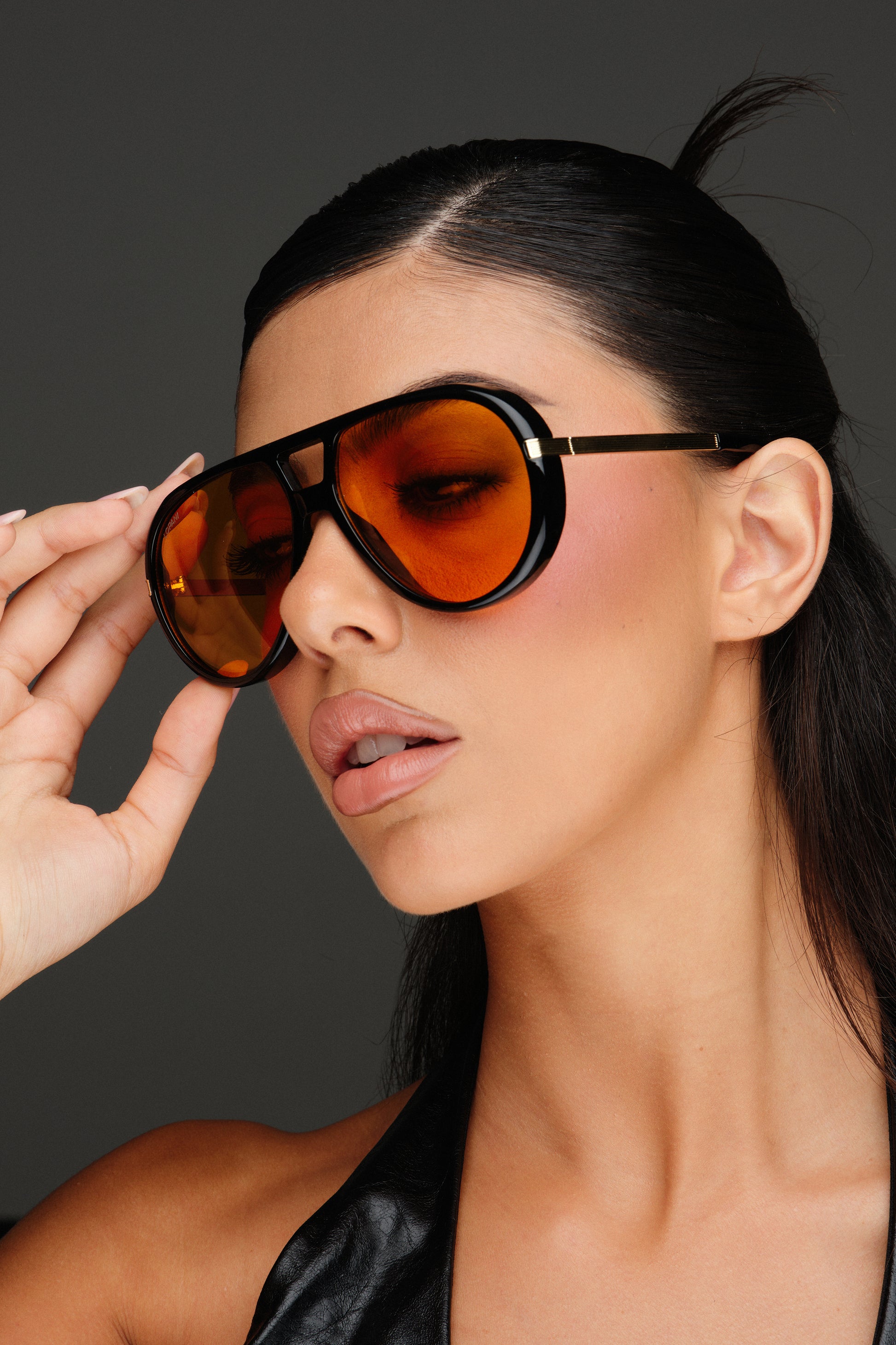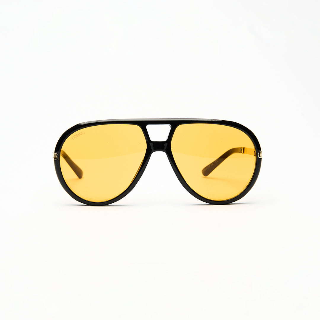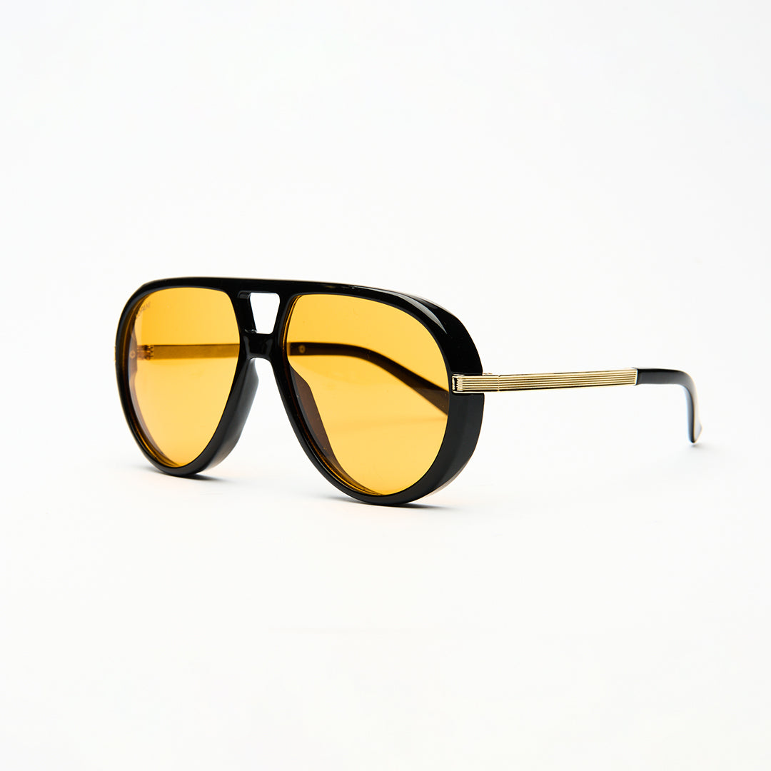 Occhiali da sole unisex stile aviator con montatura nera lucida e lenti gialle. Il design ampio e iconico dona un look deciso e contemporaneo, mentre le aste con dettaglio dorato aggiungono un tocco elegante. Perfetti per chi vuole distinguersi con uno stile audace e moderno.