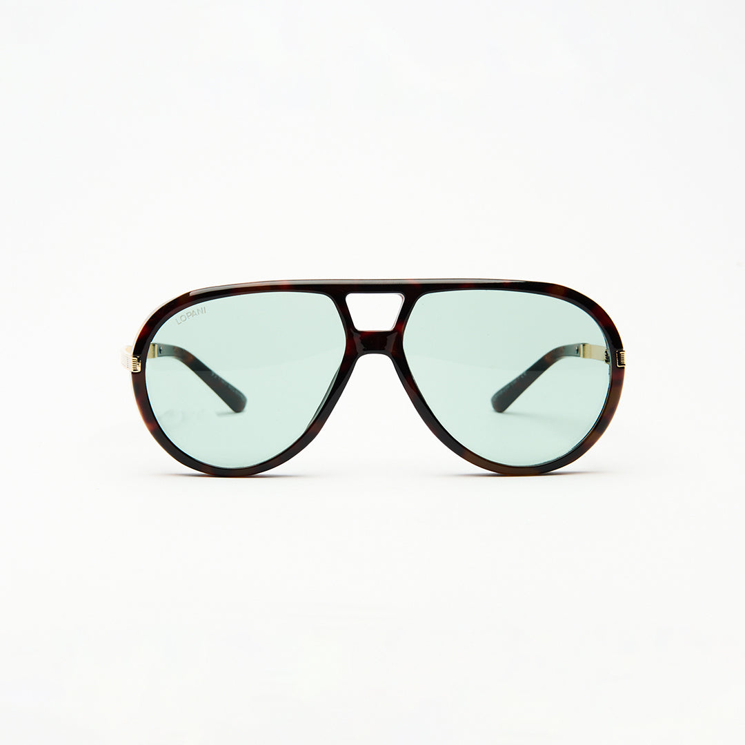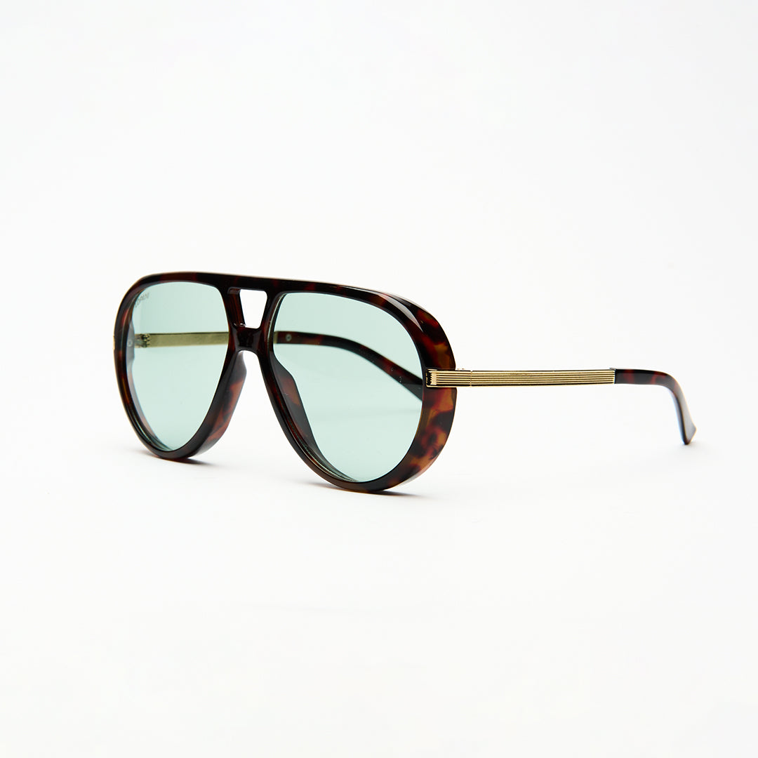Occhiali da sole unisex stile aviator con montatura tartarugata e lenti verde chiaro. Il design ampio e classico offre un look intramontabile, mentre le aste con dettaglio dorato aggiungono un tocco di eleganza. Ideali per chi desidera uno stile distintivo e una protezione quotidiana con personalità.