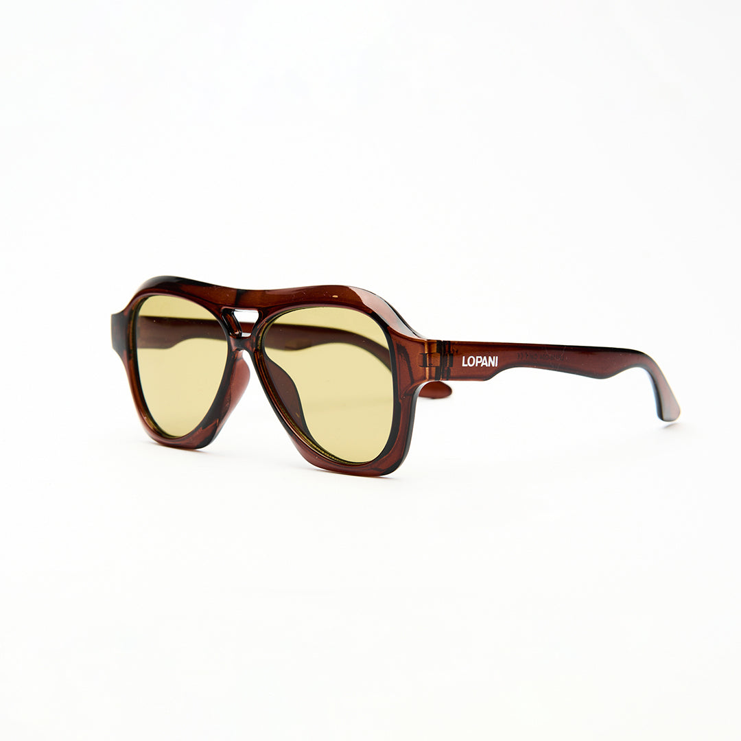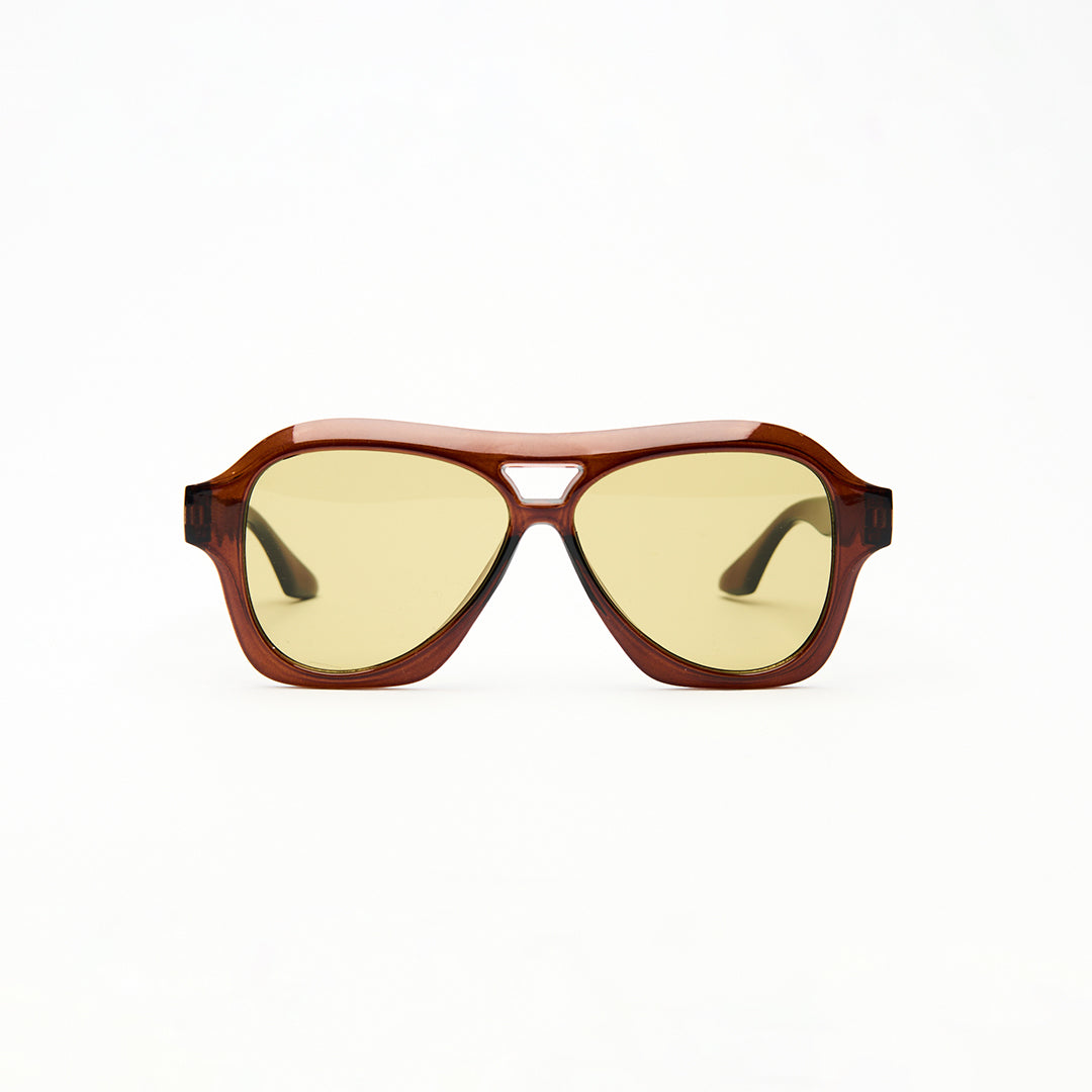 Occhiali da sole unisex con montatura trasparente color cognac e lenti giallo chiaro. Il design avvolgente in stile aviator unisce comfort e carattere, mentre la finitura semitrasparente dona un tocco vintage e distintivo. Ideali per uno stile casual e ricercato.