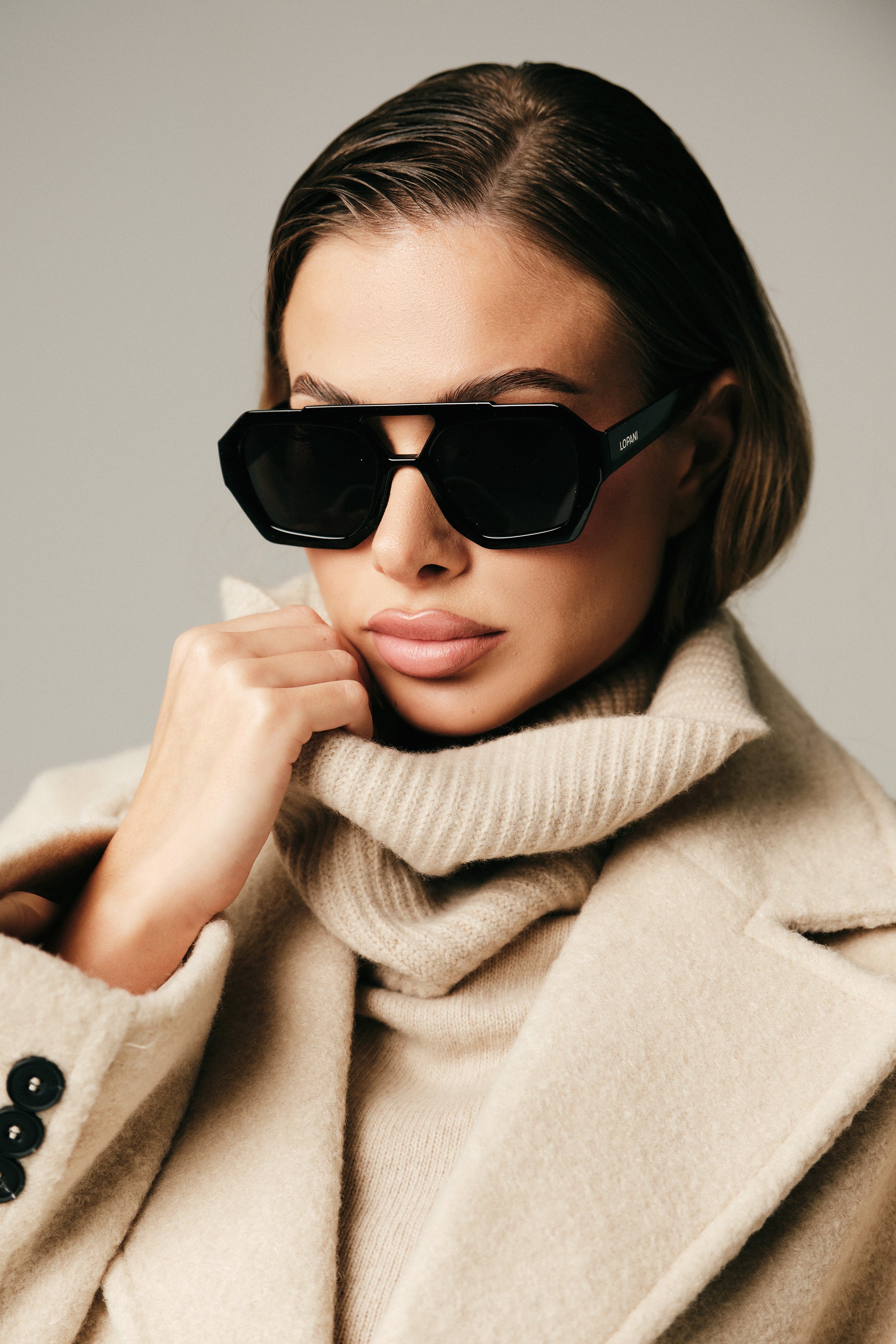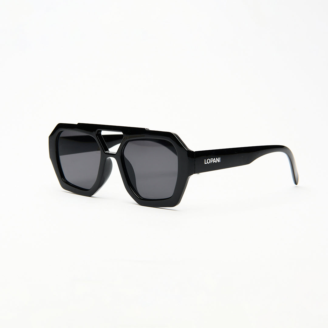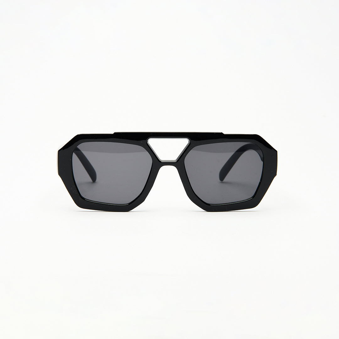 Occhiali da sole unisex con montatura nera geometrica e lenti grigio scuro. Il design deciso e moderno, caratterizzato da forme squadrate e ponte superiore aperto, dona uno stile audace e contemporaneo. Perfetti per chi cerca un look distintivo e dal forte impatto visivo.