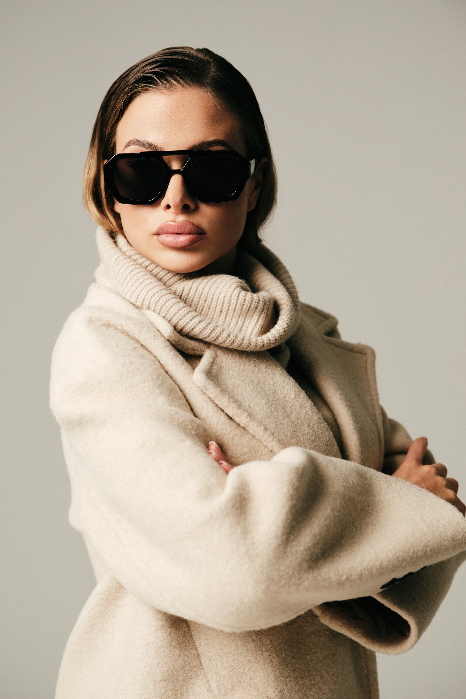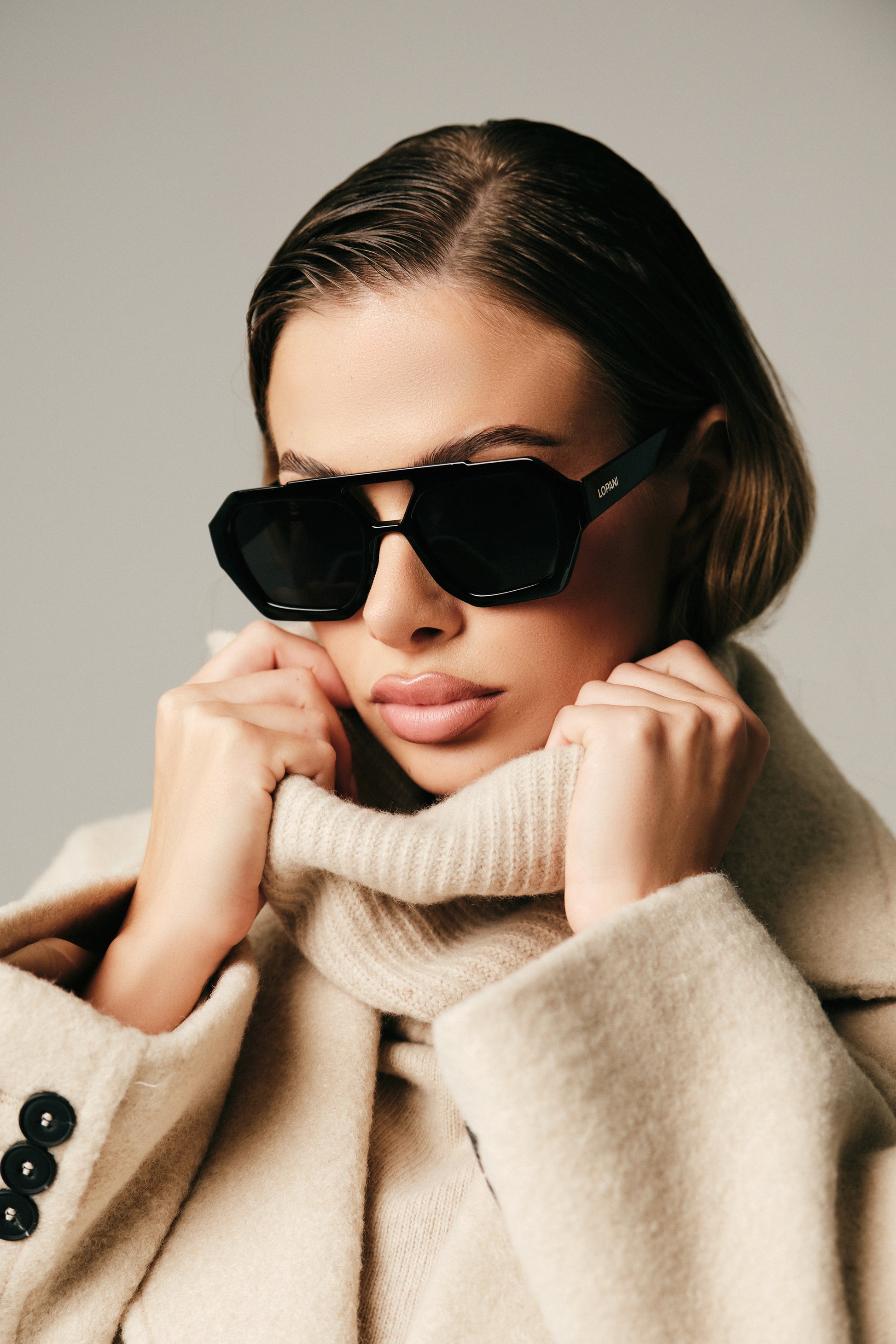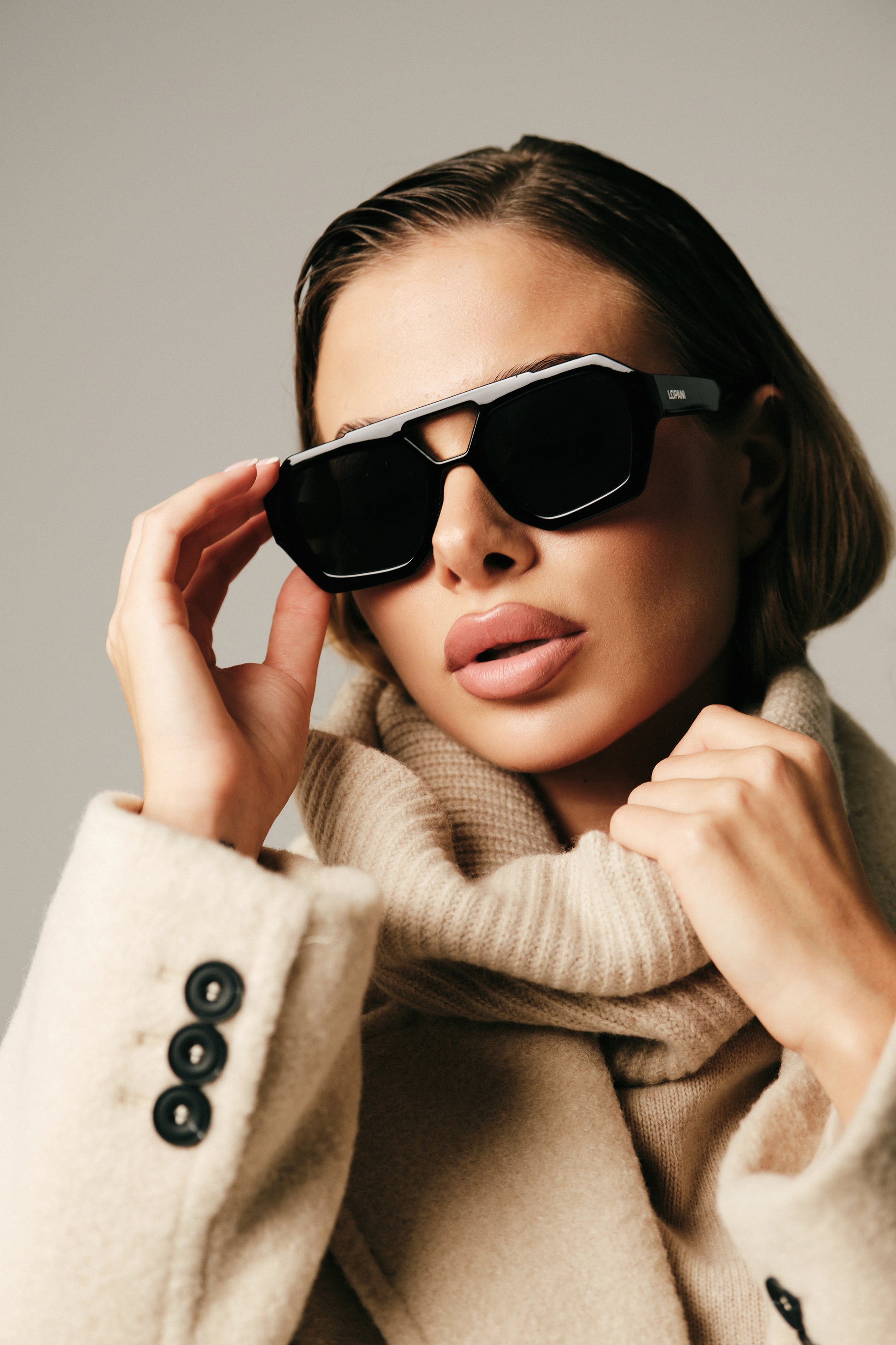 Occhiali da sole unisex con montatura nera geometrica e lenti grigio scuro. Il design deciso e moderno, caratterizzato da forme squadrate e ponte superiore aperto, dona uno stile audace e contemporaneo. Perfetti per chi cerca un look distintivo e dal forte impatto visivo.