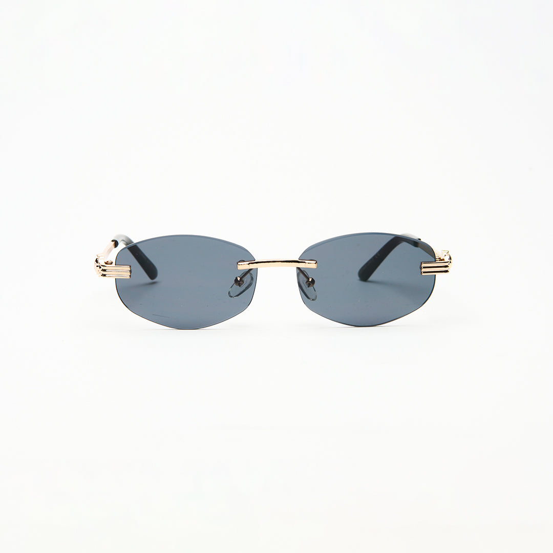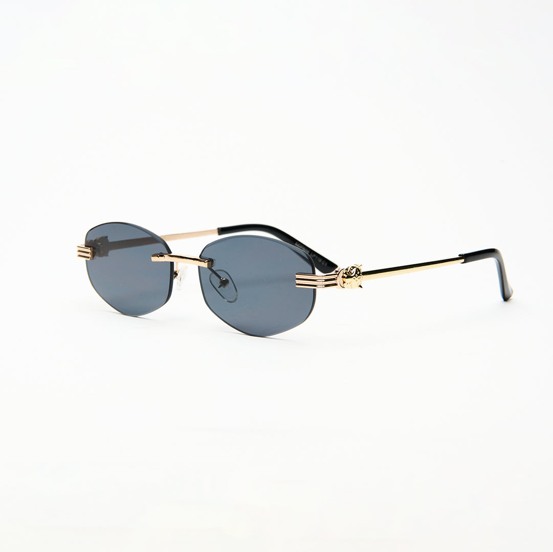 Occhiali da sole con montatura oro leggera e lenti scure.
