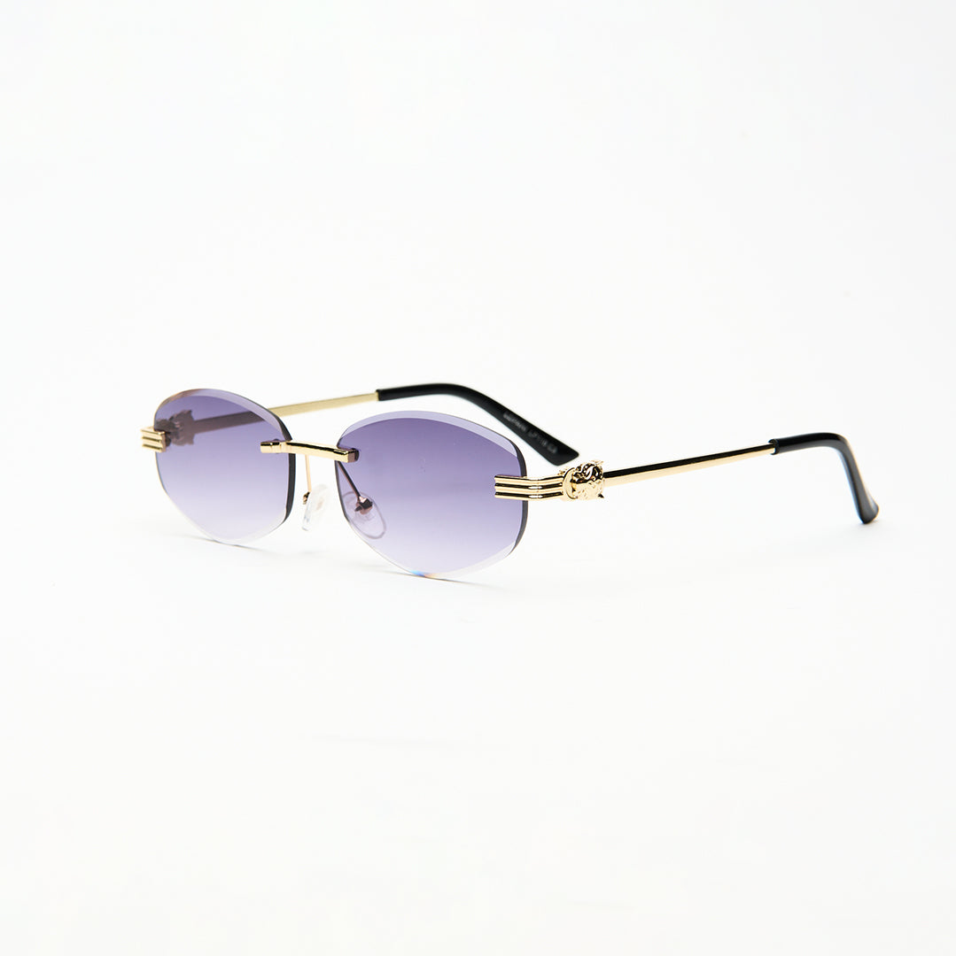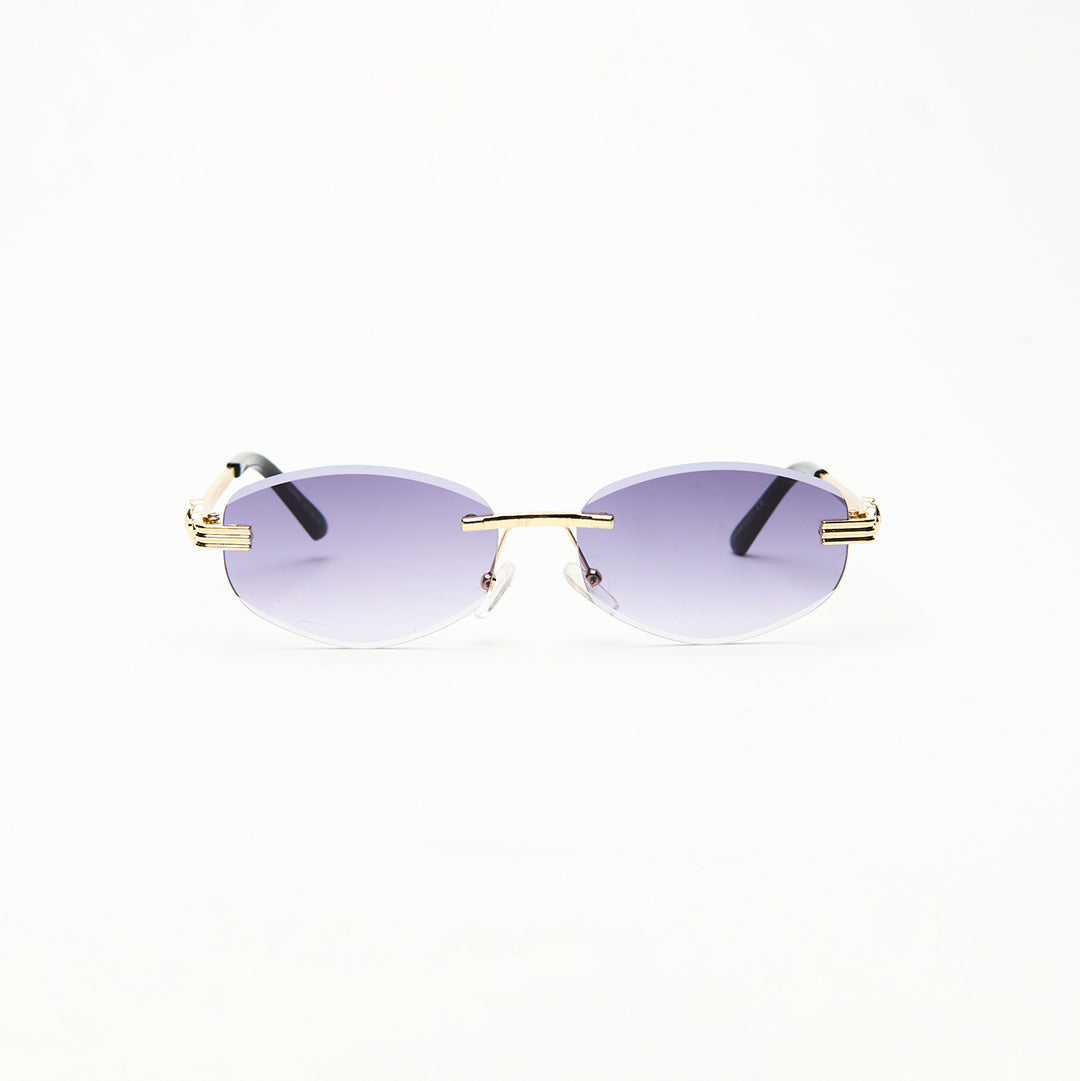 Occhiali da sole eleganti con montatura oro ultra-leggera e lenti sfumate viola.